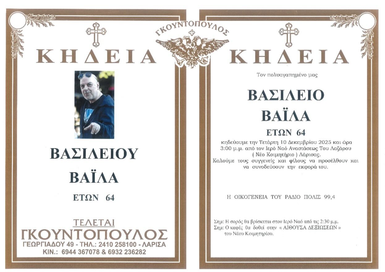 Η οικογένεια του Ράδιο Πόλις 99,4 αποχαιρετά αύριο στις 15:00 ένα μεγάλο κομμάτι της. Τον πολυαγαπημένο μας φίλο Βασίλη. Σε ευχαριστούμε για όλα, σ’αγαπάμε και μας λείπεις ήδη.