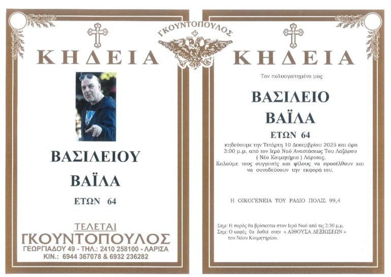 insert_link 3 55 Χωρίς κατηγορία ΑΠΟΧΑΙΡΕΤΟΥΜΕ ΤΟΝ ΑΓΑΠΗΜΕΝΟ ΜΑΣ ΑΝΘΡΩΠΟ!! Η οικογένεια του Ράδιο Πόλις 99,4 αποχαιρετά αύριο στις 15:00 ένα μεγάλο κομμάτι της. Τον πολυαγαπημένο μας φίλο Βασίλη. Σε ευχαριστούμε για όλα, σ’αγαπάμε και μας λείπεις ήδη. Καλό ταξίδι στο φως Βασίλη μας. today9 Δεκεμβρίου 2025 55 3