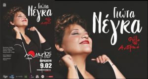 Η Γιώτα Νέγκα ερμηνεύει τραγούδια ανδρών ερμηνευτών την Παρασκευή 9 Φεβρουαρίου στο Μύλο 1927 με την υποστήριξη του Ράδιο Πόλις 99,4! Από τον Στέλιο Καζαντζίδη, τον Στράτο Διονυσίου, και τον Σταύρο Ξαρχάκο έως τον Χρήστο Θηβαίο, τον Αλκίνοο Ιωαννίδη και τον τον Νίκο Παπάζογλου την Παρασκευή 9 Φεβρουαρίου! Η Γιώτα Νέγκα την Παρασκευή 9 Φεβρουαρίου στο Μύλο 1927 με την υποστήριξη του Ράδιο Πόλις 99,4! Προπώληση: 10€ (Βιβλιοπωλείο Καλτσάς) Είσοδος: 12€ Τηλέφωνο Κρατήσεων: 2410254888