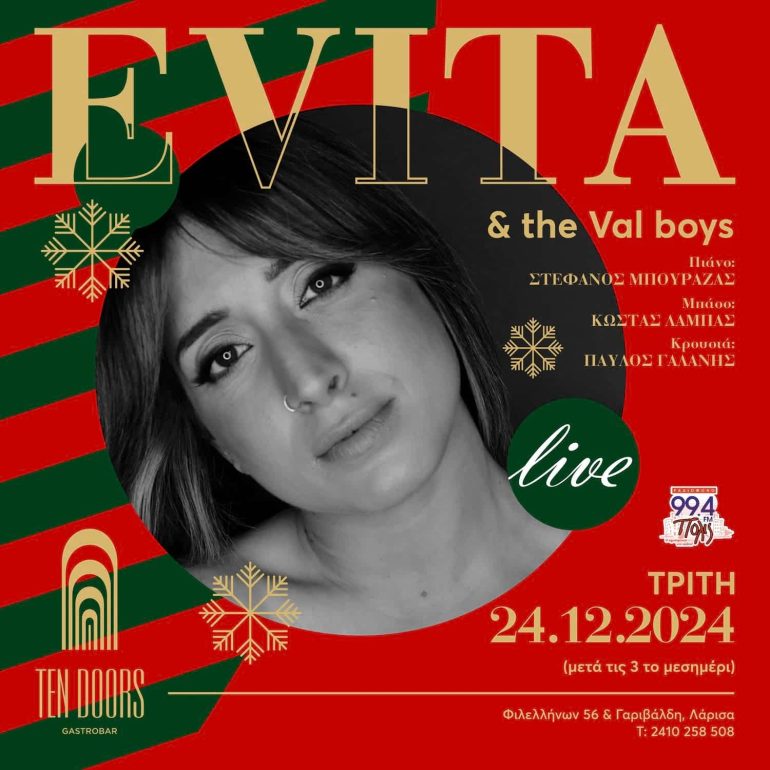 It's tiiiime! 🎄 Οι Evita & the Vals Boys θα είναι μαζί μας σήμεραΠαραμονή Χριστουγέννων μετά τις 3 το μεσημέρι με ξεχωριστές νότες και πολύ πολύ κέφι! Εσύ θα λείπεις; 🖤 Ten Doors ☎️ Κρατήσεις: 2410 258508 📍 Filellinon 56 & Garibaldi Με την υποστήριξη του Πόλις 99,4