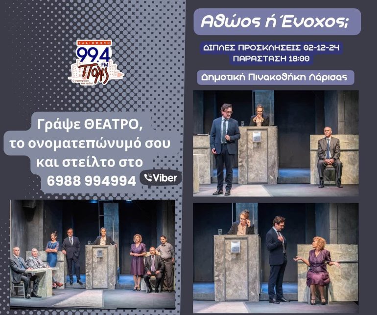 “Αθώος ή Ένοχος”: Το δυνατό δικαστικό δράμα θα παρουσιαστεί στη Δημοτική Πινακοθήκη Λάρισας τη Δευτέρα 2 Δεκεμβρίου. Ο Πόλις 99,4 μοιράζει διπλές προσκλήσεις για την παράσταση στις 6 το απόγευμα Γράψε ΘΕΑΤΡΟ, το ονοματεπώνυμό σου και στείλτο στο Viber του Πόλις 6988 994 994. ΠΡΟΣΟΧΗ: Οι προσκλήσεις είναι μόνο για την παράσταση στις 6 το απόγευμα Η κλήρωση θα γίνει την Παρασκευή 29 Νοεμβρίου. Μάθε περισσότερα για την παράσταση εδώ