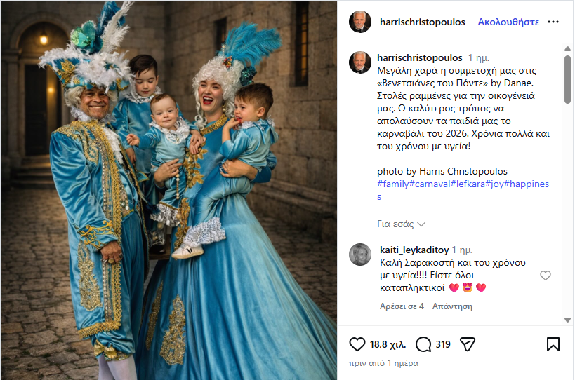 Στη λεζάντα της δημοσίευσης έγραψε: «Μεγάλη χαρά η συμμετοχή μας στις “Βενετσιάνες του Πόντε” by Danae. Στολές ραμμένες για την οικογένειά μας. Ο καλύτερος τρόπος να απολαύσουν τα παιδιά μας το καρναβάλι του 2026. Χρόνια πολλά και του χρόνου με υγεία».