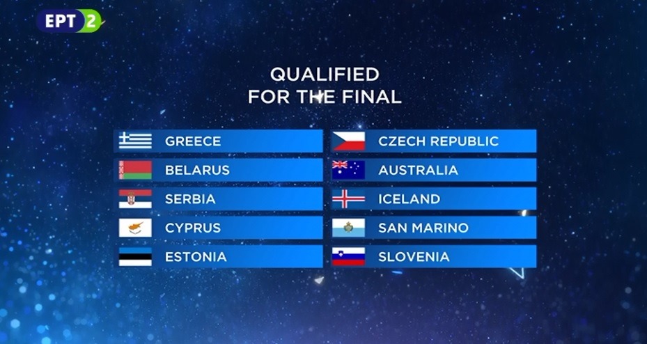 00:03 Η ώρα που όλοι περιμέναμε έφτασε. Οι παρουσιαστές ανακοινώνουν τα ονόματα όσων προκρίνονται στον Τελικό. Οι δέκα χώρες που περνούν από τον Α΄Ημιτελικό είναι με τυχαία σειρά: