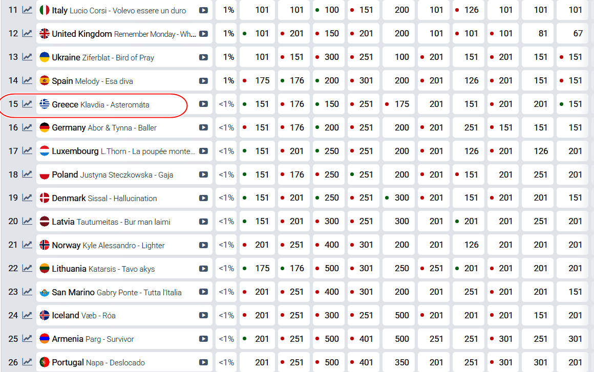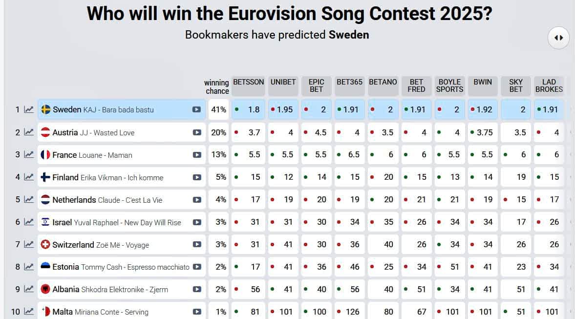 Eurovision 2025 Τα στοιχήματα, όπως παρουσιάζονται μέσω της ιστοσελίδας, eurovisionworld.com, δεν έχουν αλλάξει σημαντικά, ως προς την πρώτη πεντάδα που «βλέπουν» οι στοιχηματικές εταιρείες. Η «Αστερομάτα» κινείται εκτός δεκάδας, ωστόσο ελπίζουμε σε αρκετές ψήφους από τις κριτικές επιτροπές.