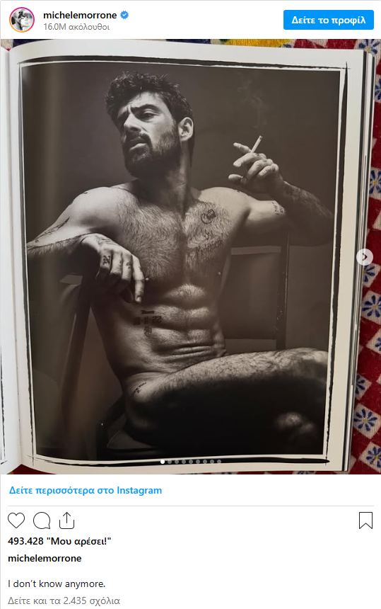 Ο Michele Morrone μοιράστηκε στο Instagram μια σειρά από φωτογραφίες με ιδιαίτερα τολμηρή αισθητική, στις οποίες ποζάρει γυμνός κρατώντας τσιγάρο, προκαλώντας έντονες αντιδράσεις και σχόλια από τους διαδικτυακούς του ακόλουθους. Η ανάρτηση επανέφερε για ακόμη μία φορά τη συζήτηση γύρω από την εικόνα του ως ενός από τους πιο δημοφιλείς και ελκυστικούς ηθοποιούς της γενιάς του.