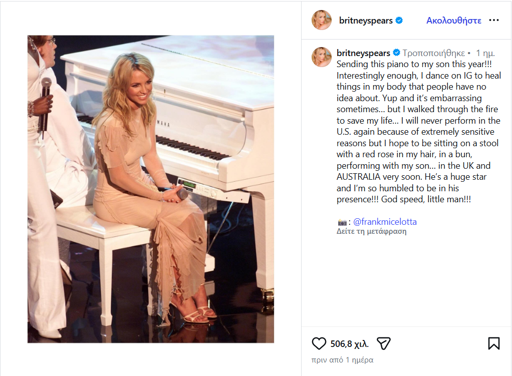 Η Σπίαρς δεν διευκρίνισε σε ποιον από τους δύο γιους που έχει αποκτήσει με τον πρώην σύζυγό της, Κέβιν Φέντερλαϊν, αναφέρεται. Σε παλαιότερη ανάρτησή της στο Instagram, τον Μάρτιο του 2025, η ποπ σταρ είχε χαρακτηρίσει τον έναν από τους γιους της, τον Τζέιντεν, «ιδιοφυΐα», ενώ είχε δημοσιεύσει βίντεο στο οποίο τον έδειχνε να παίζει πιάνο.