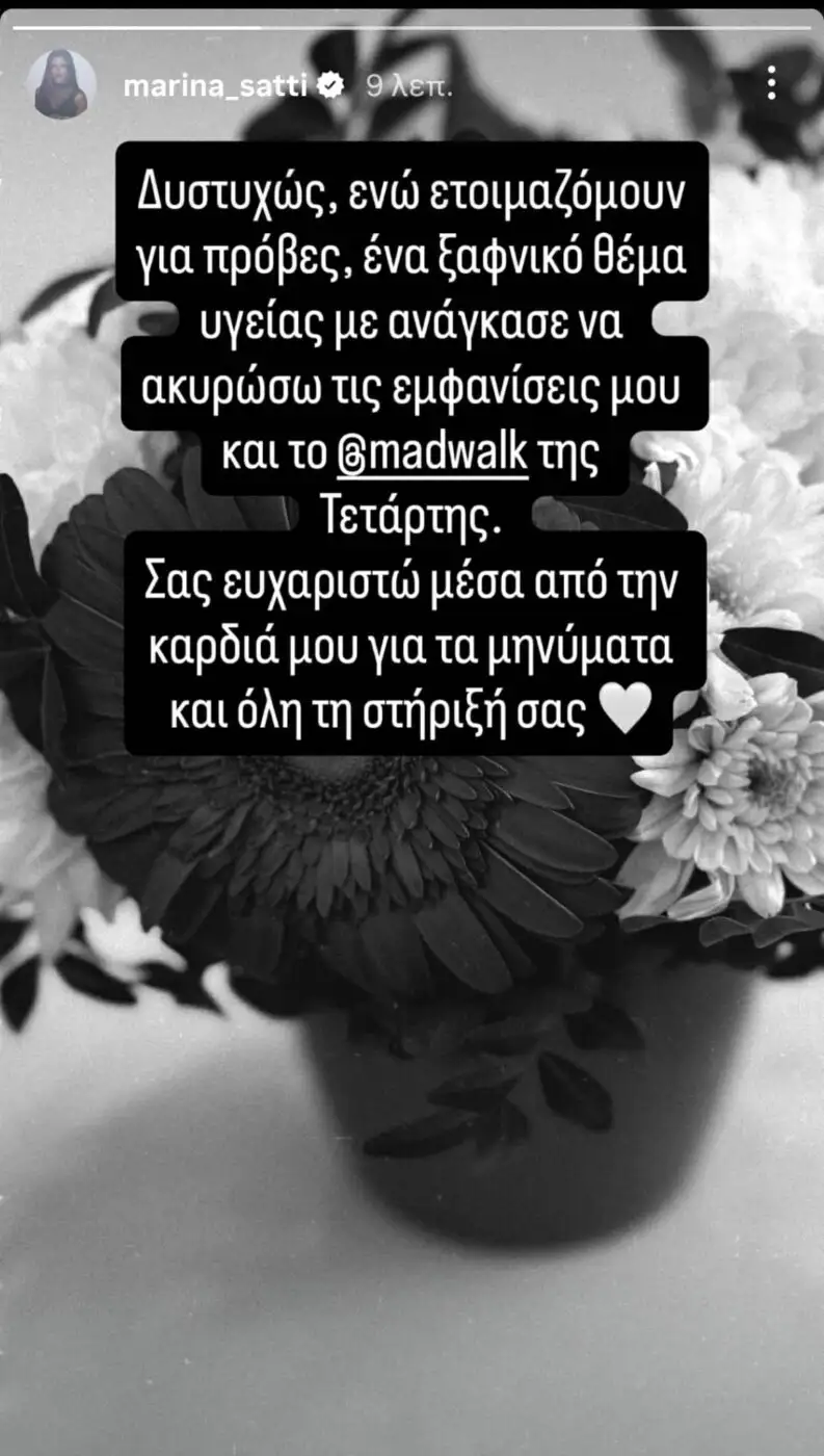 «Δυστυχώς, ενώ ετοιμαζόμουν για πρόβες, ένα ξαφνικό θέμα υγείας με ανάγκασε να ακυρώσω τις εμφανίσεις μου και το MadWalk της Τετάρτης. Σας ευχαριστώ μέσα από την καρδιά μου για τα μηνύματα και όλη τη στήριξή σας».