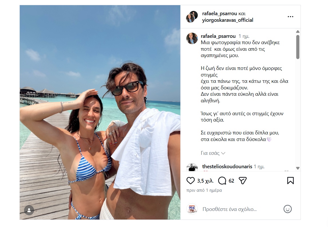 Η Ραφαέλα Ψαρρού μοιράστηκε στα social media μια αδημοσίευτη φωτογραφία από το ταξίδι της με τον σύζυγό της, Γιώργο Καράβα, στις Μαλδίβες, συνοδεύοντάς τη με ένα προσωπικό και ουσιαστικό μήνυμα.