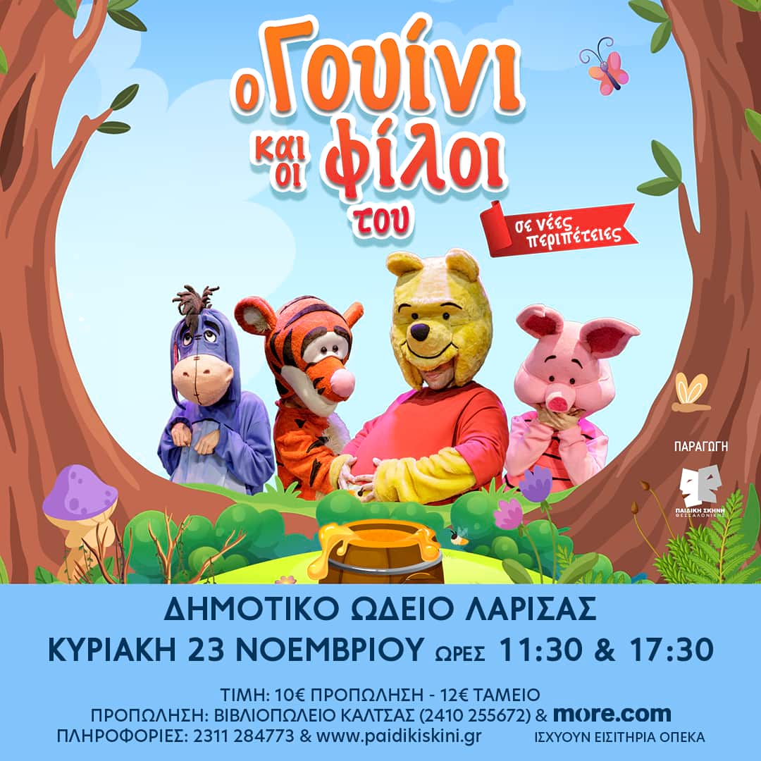Το αγαπημένο αρκουδάκι των παιδιών και η παρέα του ζωντανεύουν στη σκηνή μέσα από τη νέα παραγωγή της Παιδικής Σκηνής Θεσσαλονίκης, «Ο Γουίνι και οι φίλοι του σε νέες περιπέτειες!», μια παράσταση γεμάτη χιούμορ, μουσική, φαντασία και μπόλικη…τιγροσύνη, που αναδεικνύει τη σημασία του να πιστεύεις στον εαυτό σου, να σηκώνεσαι κάθε φορά που πέφτεις και να μη χάνεις ποτέ μα ποτέ τη χαρά του παιχνιδιού! Έρχεται στο Δημοτικό Ωδείο Λάρισας, για δύο μόνο παραστάσεις στις 23 Νοεμβρίου στις 11:30 και στις 17:30.