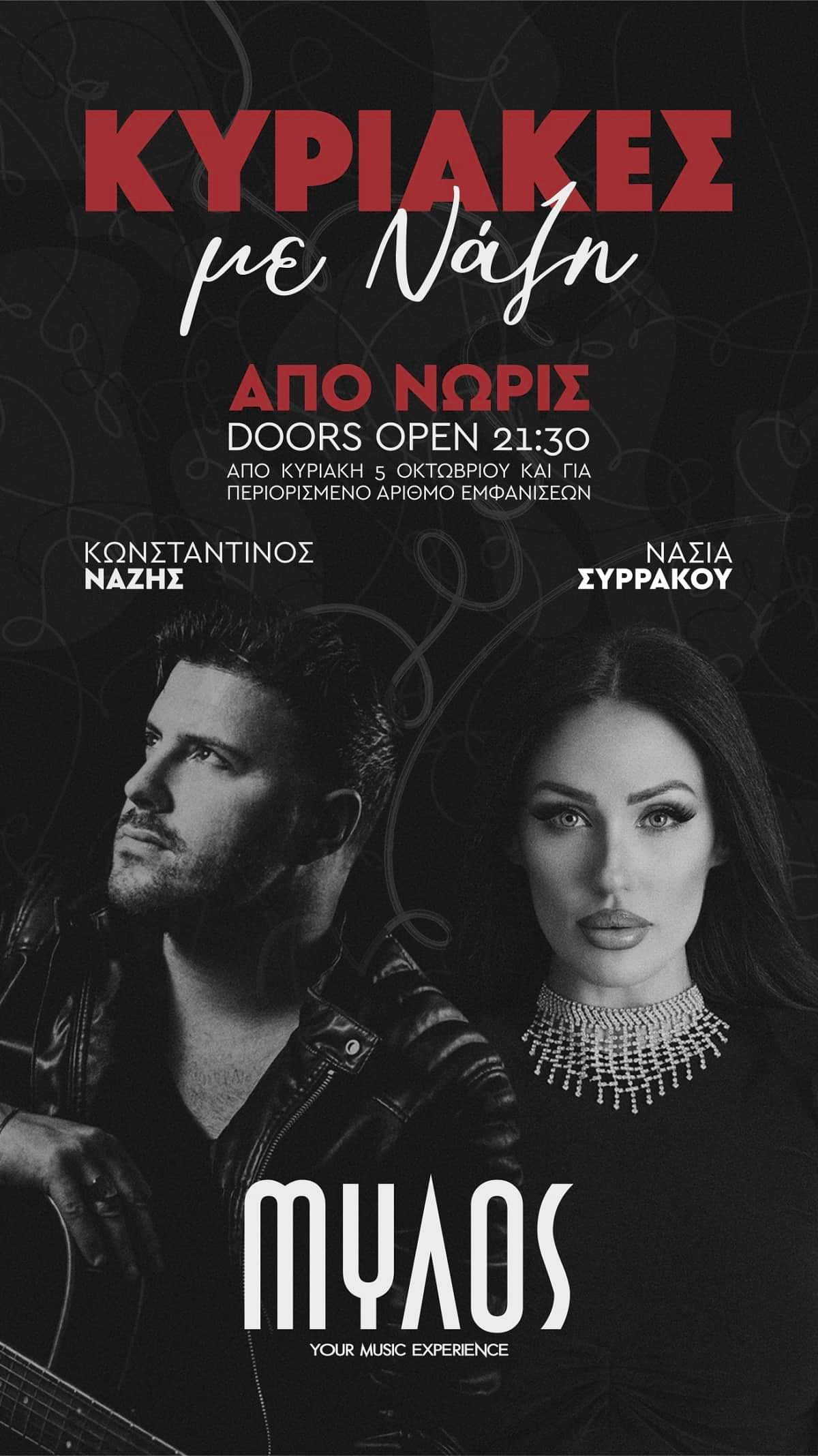 Η πόλη αλλάζει σελίδα στη διασκέδαση και ο Μύλος γίνεται το απόλυτο σημείο συνάντησης κάθε Κυριακή βράδυ. Ο Κωνσταντίνος Νάζης και η Νάσια Συρράκου ενώνουν τις δυνάμεις τους και υπόσχονται βραδιές γεμάτες ένταση, συναίσθημα και αγαπημένες επιτυχίες.