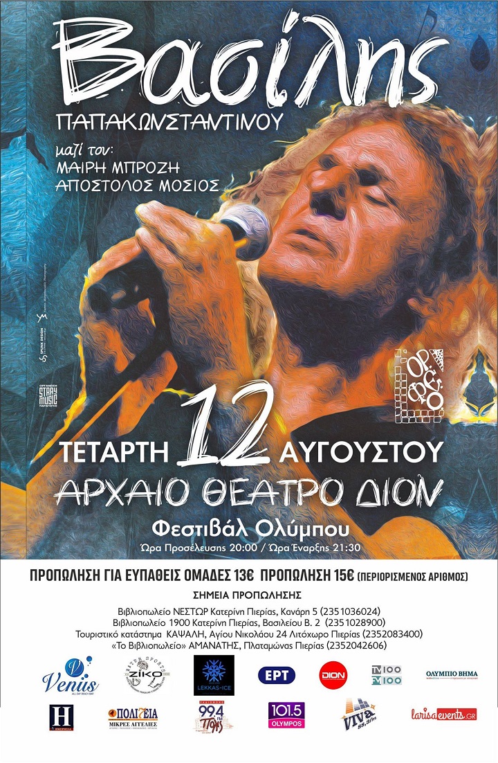Ο Βασίλης Παπακωνσταντίνου την Τετάρτη 12 Αυγούστου στο Φεστιβάλ Ολύμπου στο Αρχαίο Θέατρο Δίου με την υποστήριξη του Ράδιο Πόλις 99,4!