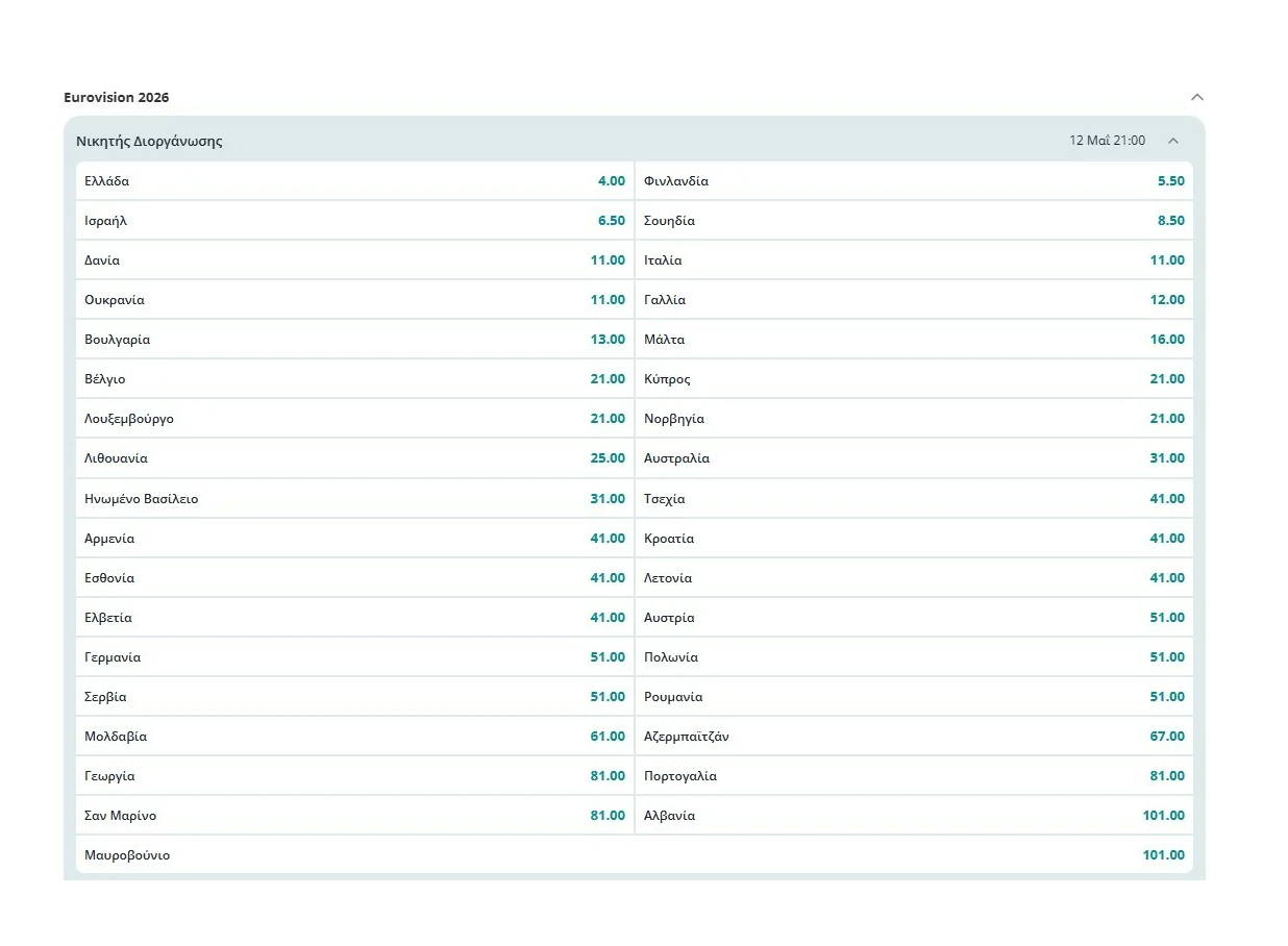 Σύμφωνα με γνωστή στοιχηματική εταιρεία, ο Έλληνας εκπρόσωπος κατατάσσεται ήδη στην πρώτη θέση των αποδόσεων για τη νίκη, με βάση τα μέχρι στιγμής δεδομένα και τις συμμετοχές που έχουν ανακοινωθεί.