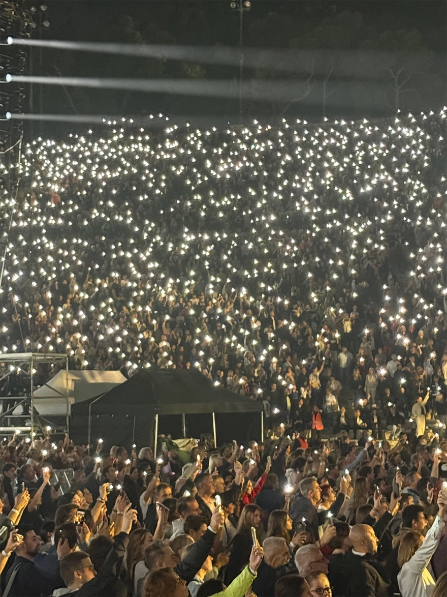 Οι 32.000 θεατές-υπήρξαν πολλοί ειδικά από την επαρχία που δεν κατέβηκαν φοβούμενοι την βροχή-τον υποδέχτηκαν στις εννιά με αποθεωτικό χειροκρότημα και ουρλιαχτά και αυτός φρόντισε να τους αποζημιώσει με μια εξαιρετική μουσικοχορευτική παράσταση.